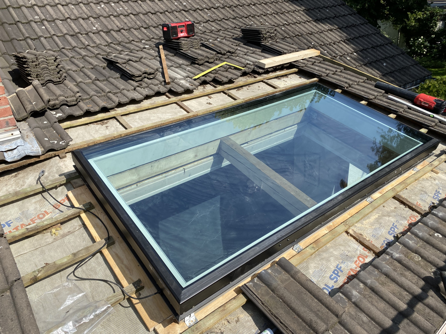 Overigens: de kabel die op de foto is te zien, is een voorbereiding voor een elektrische buitenzonwering. Die doorvoer is daarbij netjes in de opstand van de lichtstraat weggegewerkt, zo dat er geen losse kabels over het dak lopen nadat de zonwering is aangebracht.
