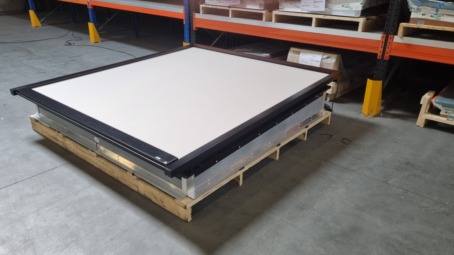 Hieronder enkele foto's voorafgaand aan verzending. In dit geval werd de buitenzonwering al gemonteerd en ingeregeld op het daklicht geplaatst. Zodoende is montage ter plaatse nog slechts een kwestie van plaatsing.