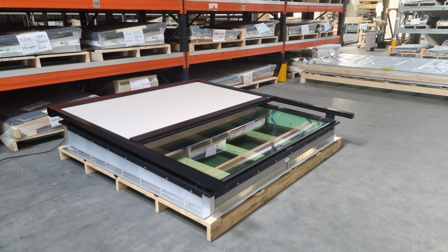 Hieronder enkele foto's voorafgaand aan verzending. In dit geval werd de buitenzonwering al gemonteerd en ingeregeld op het daklicht geplaatst. Zodoende is montage ter plaatse nog slechts een kwestie van plaatsing.