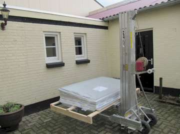 Alle Vlakkelichtkoepels worden altijd inclusief eigen onderliggende pallet geleverd. En met pallet en al op het dak gehesen, waarbij de hijsstroppen onder de pallet komen. De kleinere maten worden dan vervolgens met de hand over de dakopening geplaatst. Maar bij de zwaardere uitvoeringen gaat dat niet meer. Bij gewichten > 160 Kg zorgen wij daarom standaard voor een extra hijsconstructie. Zodoende kan de kraan dan ook deze tweede hijs in één moeite door verzorgen. Lees verder: dubbele hijsconstructie